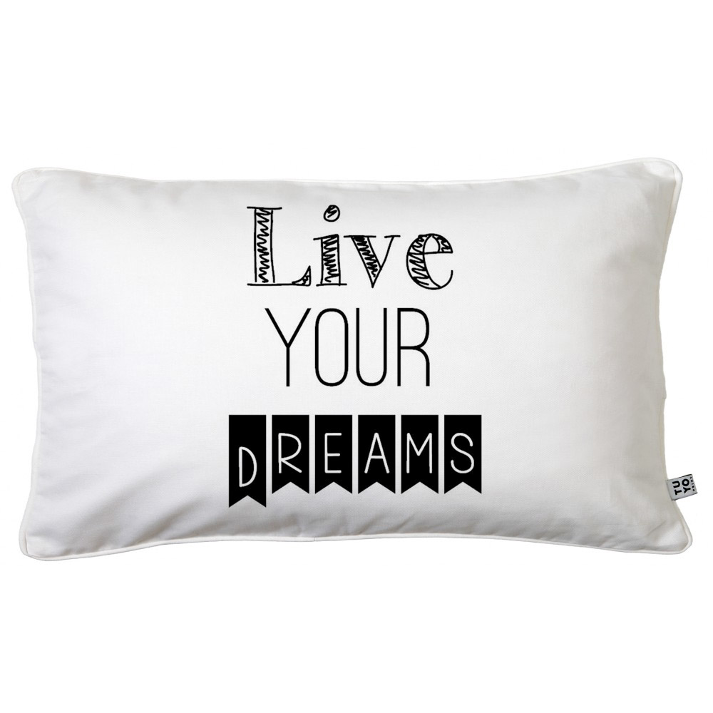 Cojín Inspiración / Live your Dreams en Gabardina blanca estampado 50×30 cm.
