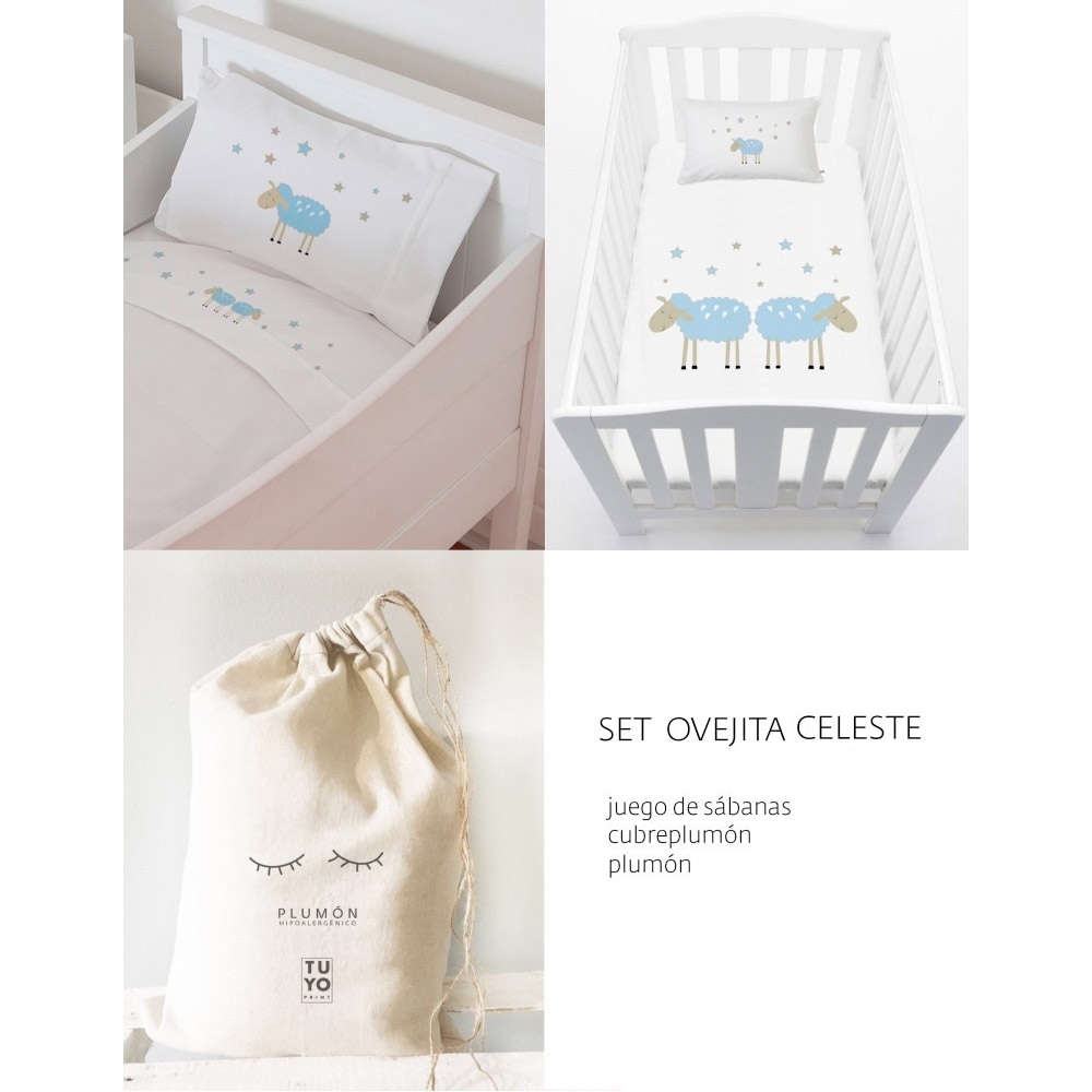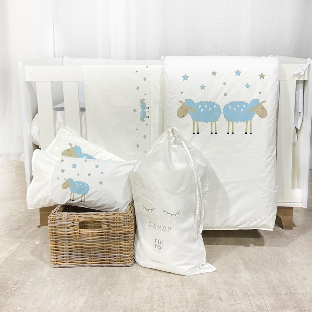 Tu bebé podrá tener los más lindos sueños con este Set de Cuna Ovejita Celeste hipoalergénico, 100% algodón.